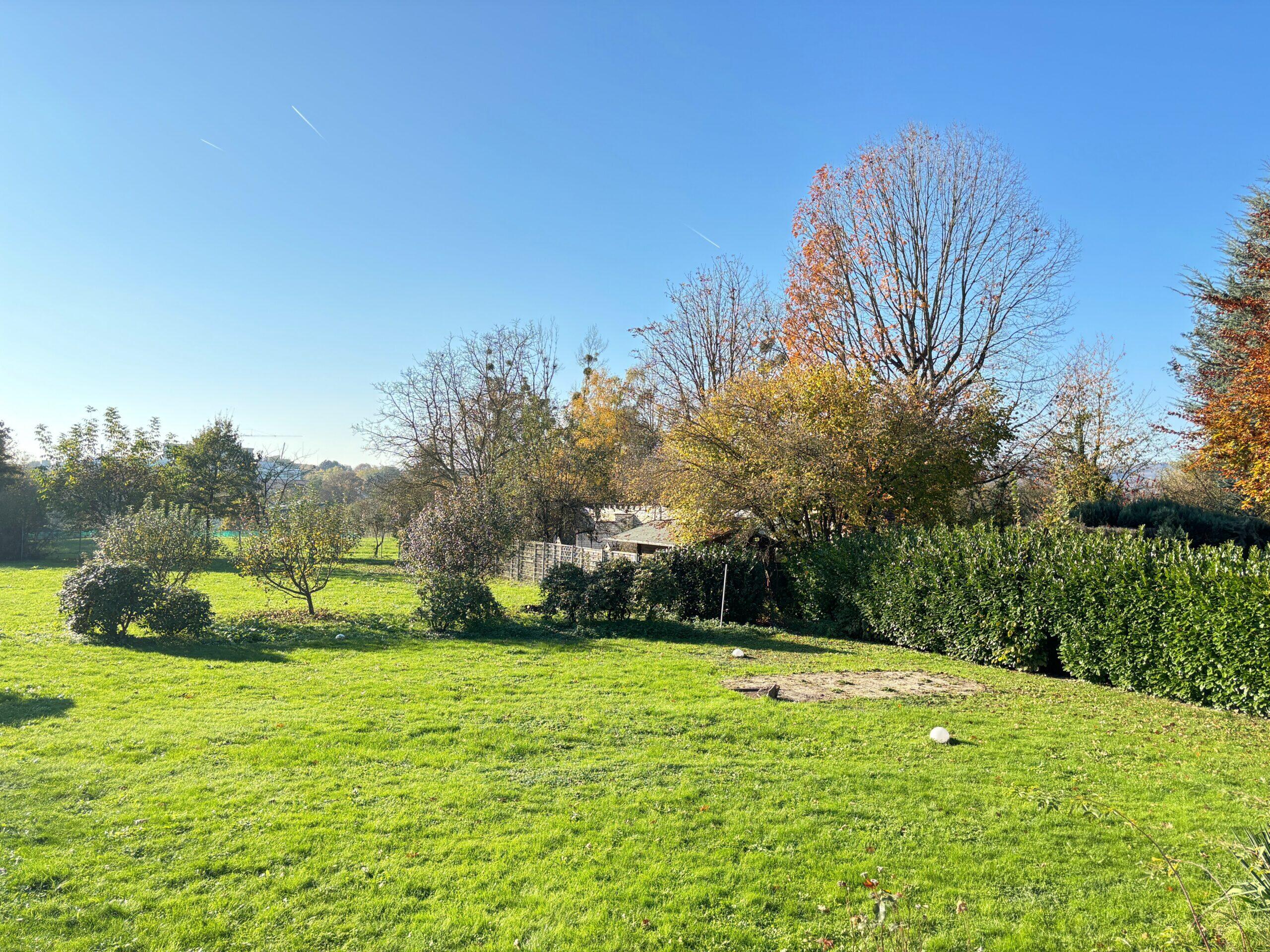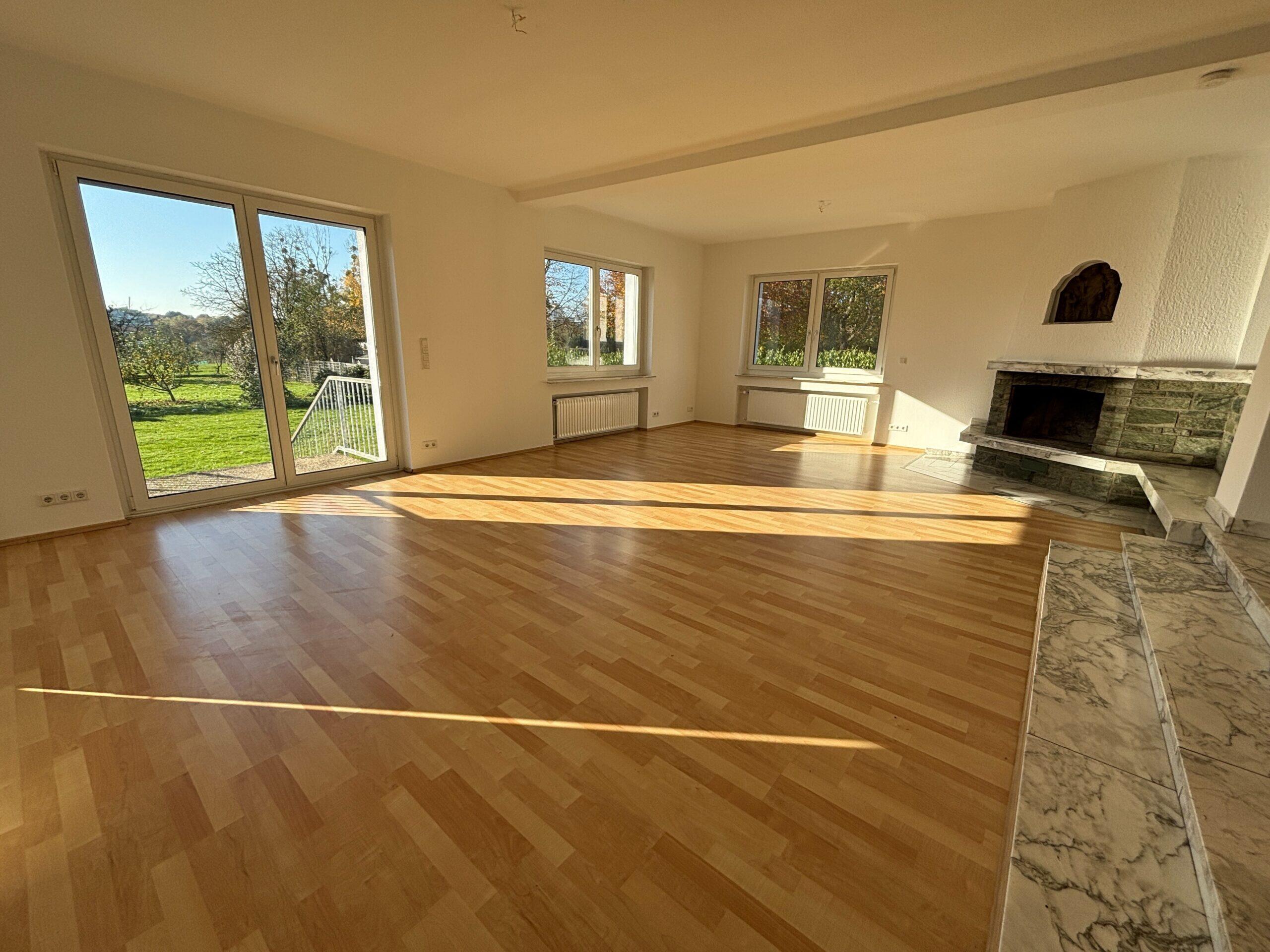Hier erwartet Sie und Ihre Familie ein XXL Gartenparadies. Auch der Wohn/Küchen/Essbereich ist überdurchschnittlich groß und wird mit Sicherheit der Mittelpunkt Ihrer Familie sein. Diese Wohnung müssen Sie gesehen haben – sie wird „Sie“ begeistern. Diese anspruchsvolle, lichtdurchflutete GROSS-Wohnung mit riesigem S/W Garten befindet sich in einem sehr gepflegten Dreifamilienhaus in ruhiger Lage mit viel Grün drumherum. Die ca. 172 qm Wohnfläche mit 4,5 Zimmern sind fast ebenerdig, sehr gut aufgeteilt und bieten Ihnen und Ihrer Familie vielseitige Möglichkeiten. 3 Schlafzimmer und 2 Tageslichtbäder sind die perfekte Basis um sich hier wohlzufühlen. Eines der Bäder ist direkt angrenzend zum Elternschlafzimmer. Hier ist bereits ein großer Einbauschrank vorhanden. In allen Räumen sind Rollläden angebracht, manche davon sind bereits elektrisch. Die moderne Einbauküche gehört zu der Wohnung; direkt nebenan können Sie Ihren großen Esstisch platzieren. Wohn/Essbereich ist auf 2 Ebenen verteilt. Der Wohnbereich liegt im unteren Bereich und bietet aufgrund der Größe viel Platz für eine großzügige Sofalandschaft. Genießen Sie die Winterabende an Ihrem offenen Kamin. Angrenzend an das Wohnzimmer befindet sich ein weiteres Zimmer welches wunderbar als Homeoffice genutzt werden kann. Vom Wohnbereich aus gelangen Sie über ein paar Stufen direkt in den Garten. Diverse Deckenspots gibt es bereits in der Wohnung- überall ist schöner Laminatfußboden verlegt. Eine Sattelitenschüssel ist auf dem Dach installiert. Zu der Wohnung gehört 1 separater, großer, nicht einsehbarer Keller. Platz für Ihre Waschmaschine und Ihren Trockner ist in der Waschküche vorhanden. 1 Garage für 90,00 € und einen Stellplatz für 75,00 € können Sie dazu mieten. Weitere Parkmöglichkeiten gibt es auch auf der Straße. Zu dem Garten: Die jetzigen Mieter haben sich für den Garten einen Mähroboter angeschafft. Er verrichtet täglich seine Arbeit. Sie haben in Ihrem Garten mit seiner Süd/ West Ausrichtung viel Sonne und mehrere Möglichkeiten Sitzplätze zu schaffen. Auch können Sie für Ihre Kinder ein Spieleparadies gestalten wie zum Beispiel: eine Hüpfburg, Trampolin, Planschbecken etc.